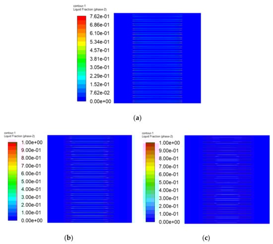 Liquid fraction contours of the PEMFC stack at different times; (a) t = 24 s, (b) t = 32 s, (c) t = 36 s.
