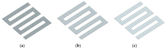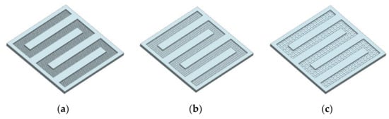 The three-dimensional structure of electrothermal film ((a) pore size = 0.3 mm, (b) pore size = 0.6 mm, (c) pore size = 1.2 mm).