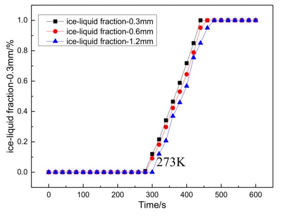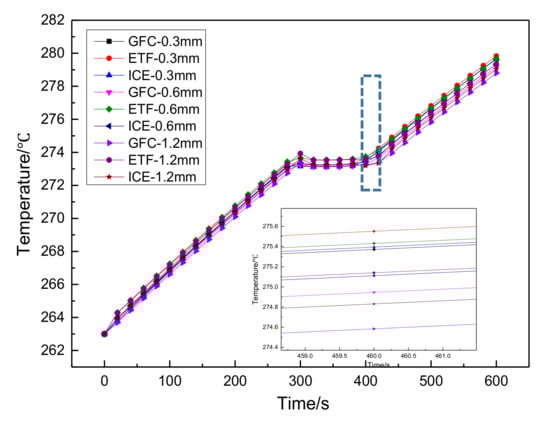 Figure 22 shows the process of the average temperature of each layer of ETF with different pore sizes over time; it can be seen that as the time increases, the temperature of each layer gradually increases, where the temperature of the ETF layer is the highest. The ICE layer is second and the GFC layer is the lowest. It can also be seen that when the temperature rises to 273 K, the ice starts to melt, and the complete melting time lasts for about 10 s. From the beginning to the end of the melting, the temperature curvature of each layer is small. This is because the ice needs to absorb heat during the melting process. After the ice has been completely melted, the temperature of each layer continues to rise. The lower right corner is an enlarged average temperature value of each layer of different ETF pore sizes at 46 s. It can be clearly seen that at the same porosity, the ETF with a hole size of 0.3 mm has the higher temperature compared to the ETF with a 0.6-mm hole size. The temperature of 1.2 mm is the lowest.