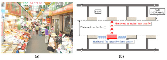 Figure 1a presents a picture of a passage-type traditional market taken during the field survey process, and the field survey process is described later. Facing stores are arranged in parallel, and these structures are generally similar. The width of the passage varies slightly from market to market, but is generally about 3.0 m. However, as shown in Figure 1a, stalls placed in the passage reduce the width of the passage and the distance between combustibles. Due to the characteristics of these traditional markets, the fire spread, as shown in Figure 1b, may occur. As mentioned earlier, the fire probability of passage-type traditional markets can be classified into two types. Horizontal fire spread refers to the fire spread along the combustible materials of a store wall or stalls via direct contact with the flames. Since this type of fire spread is limited to stores along the same line, damage can be reduced through water curtain systems or fire shutters considering the fire spread rate. Implementing these systems may also be effective in preventing the fire spread in facing stores via radiant heat flux. However, from a conservative point of view, it may be effective to ensure a minimum distance (r) in which the radiant heat flux—which is emitted from a fire source and reaching the opposite store is reduced below a critical value. Therefore, in order to ensure safety by preventing the fire spread in traditional markets, it is necessary to assess the fire spread rate and separation distance of major combustibles through experiments.