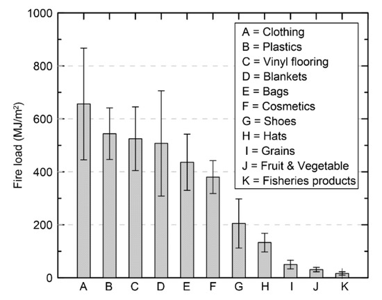 - Zalok, E.; Hadjisophocleous, G.V.; Mehaffey, J.R. Fire loads in commercial premises. Fire Mater. 2009, 33, 63–78. [Google Scholar] [CrossRef]