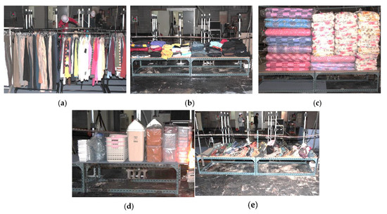 Photographs of the major combustibles arranged to conduct real-scale fire experiments: (a) Clothing hanging on the hangers; (b) clothing placed on the stalls; (c) blankets placed on the stalls; (d) plastics placed on the stall; (e) bags placed on the stalls.