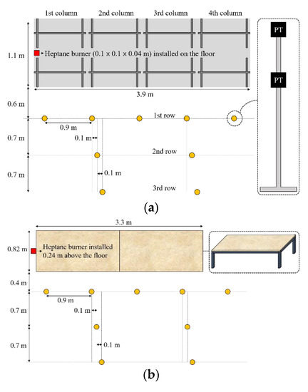 Layout of plate-thermometer stands for measuring the incident radiant heat flux of major combustibles: (a) Experiment with clothing hanging on hangers; (b) experiment on combustibles placed on the stalls.