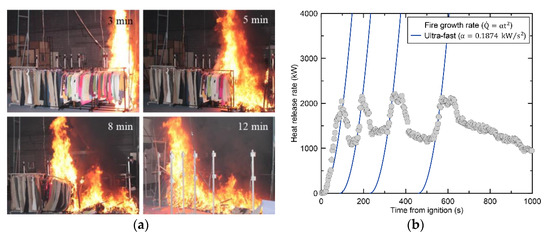 Fire spread pattern and heat release rate of clothing hanging on hangers: (a) Sequential photographs of fire spread over time; (b) measured heat release rate.