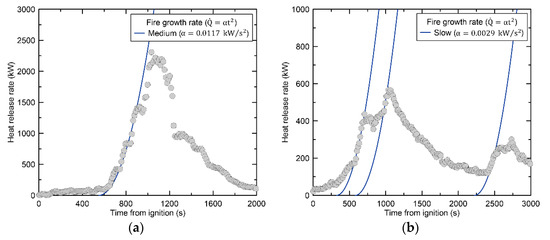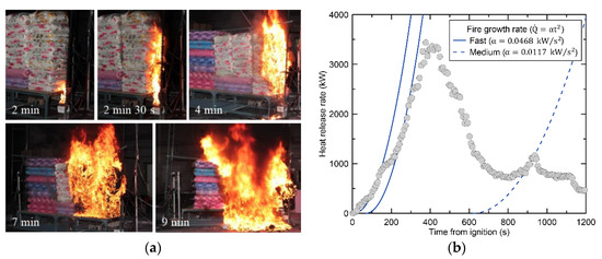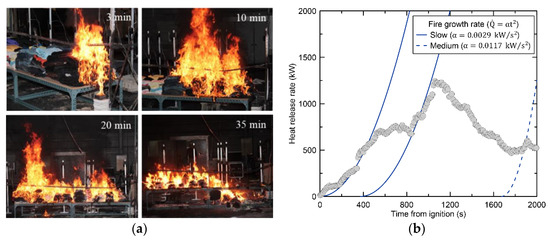 Figure 7 represents the results of an experiment where blankets were placed on stalls. Figure 7a is a sequential photographs of the fire spread pattern over time. As can be seen in the Figure 7a, combustion did not occur until 2 min after the burner was ignited. However, as the blankets’ plastic bags burned, the fire spread rapidly to the top of the combustibles in about 150 s (2 min 30 s). The fire initially exhibited a vertical spread, but it then spread horizontally along the combustible material (between 4 and 7 min). The fire spread to almost all combustibles at around 9 min, and it then spread out completely at around 11 min 30 s. Figure 7b presents the results of the heat release rate measurement. The first fire growth occurred before reaching 200 s from ignition of the burner, which is the result of vertical fire spread from the plastic bags. The fire growth rate via horizontal fire spread is also shown, indicating a ‘Fast’ fire growth rate (α = 0.0468 kW/s2). At the peak period, the maximum heat release rate exhibited a value of approximately 3500 kW. The maximum heat release rate appeared before the fire spread was completed. The fire was extinguished through decay following exhaustion of the combustibles. A temporary ‘medium’ fire growth rate (α = 0.0117 kW/s2) occurred at approximately 900 s, the cause of which was confirmed to be the collapse of the MDF panel. Horizontal fire spread rate of the blankets as identified by the video was 0.287 m/min.