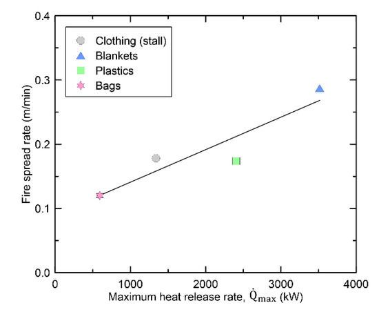 Figure 9 illustrates the relationship between the maximum heat release rate and the horizontal fire spread rate obtained through experiments. At this time, it was confirmed that the horizontal fire spread rate was affected by the collapse of the hanger, not the burning rate of the combustibles, so the experimental results of the clothing hanging on hangers were excluded. As a result, it can be seen that the horizontal fire spread rate of each combustibles has a proportional relationship to the maximum heat release rate. This relationship between the maximum heat release rate and the fire spread rate can be expressed through Equation (2):