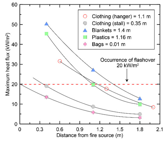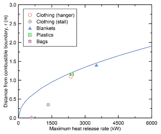 where , , , refer to the incident heat flux, radiative fraction, maximum heat release rate and distance to the target surface, respectively. If Equation (3) is rearranged for and 20 kW/m2 is substituted for , the separation distances according to the maximum heat release rate can be derived. In Figure 11, the mean value of x (0.1516), derived by rearranging Equation (3) for x, has been applied. In Figure 11, the curve agrees very well with the experimental results, except for the clothing and bags placed on the stalls with errors in the measurement of heat flux. In conclusion, it can be seen that Modak’s simple method can be used to examine the separation distance for combustibles whose maximum heat release rate and radiative fraction are known. However, when using this method, a suitable measurement location that is not affected by the view factor must be carefully selected to avoid the same error as shown in Figure 10. This is also related to the premise that the target surface should face the heat source in Modak’s simple method.