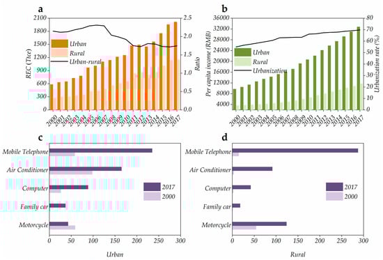 Trends of REC and related indicators in urban and rural Guangdong during 2000–2017. (a) Total REC and the ratio of urban to rural. (b) Per capita income and urbanization rate. (c) Ownership of major durable consumer goods per 100 urban households. (d) Ownership of major durable consumer goods per 100 rural households.