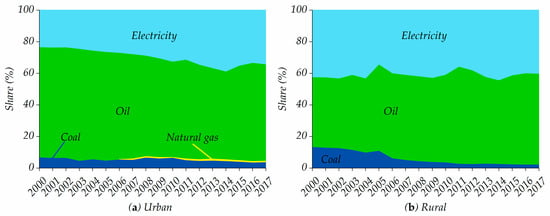 The changes in the energy structure of REC in urban and rural Guangdong are presented in Figure 3a,b respectively. As shown in Figure 3a, oil and electricity were the main energy sources for urban residents during 2000–2017, accounting for over 92%. This could be due to the growing popularity of electrical appliances and private transport. Over the study period, the share of oil always ranked first, followed by electricity, coal and natural gas. It was noteworthy that the share of oil presented a moderate declining trend, decreasing to 61.11% in 2017 from 69.82% in 2000, whereas the share of electricity increased from 23.55% to 34.40% between 2000 and 2017. Based on these trends of oil and electricity above-mentioned, oil may still dominate the energy structure of REC for a long time in the future. The coal share presented a decline trend over time, decreasing to 3.55% in 2017 from 6.62% in 2000. The share of natural gas remained relatively lower, increasing from 0.28% in 2006 to 0.95% in 2017. With the development of the economy and the improvement of residents’ living standards, the share of coal will further shrink, and may be exceeded by natural gas in the future.