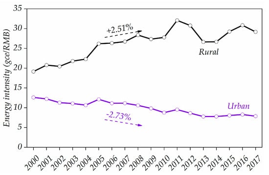 With respect to rural Guangdong, the energy intensity of REC shows an opposite trend. It rose from 19.15 gce/RMB in 2000 to 29.18 gce/RMB in 2017, with an annual average growth rate of 2.51%, suggesting that the energy efficiency of REC did not improve. The increase in the energy intensity could be explained by the following reasons. First, some of the rural residents had less awareness of energy-saving and environmental protection than urban residents. Second, traditional biomass was outpaced by the commercial energy use modes over time [7]. In fact, the trends of the energy intensity of REC in urban and rural regions in Guangdong were similar to those of the related studies [8,17]. For example, Zhang and Bai [17] found that the energy intensity of residential energy consumption increased for rural Shandong, while it decreased for urban Shandong over the study period.