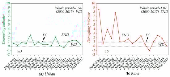 Both urban and rural regions experienced four kinds of decoupling states: WD, EC, END and SD. WD occurred in most years (52.94% of the whole period) for urban regions, while END was dominant for nearly 60% of the whole period for rural regions. Overall, the decoupling state in urban regions was more ideal overall than that in rural regions, representing a WD (0.54) and an END (1.82), respectively.