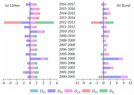 Following Equations (3)–(9), we quantified the contributions of each factor governing the REC in the urban and rural regions of Guangdong during 2000–2017, which are listed in Table A3 and Table A4, respectively. An important step of our study is to further explore the key drivers affecting the decoupling after analyzing the decoupling states. With reference to previous studies [1,59], we combine the Tapio decoupling model with the LMDI method to identify the factors affecting the decoupling process. We decomposed the decoupling indicator using Equation (10), and the corresponding decomposition results of the decoupling indicators in urban and rural Guangdong during 2000–2017 are presented in Figure 6a,b, respectively.