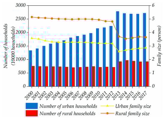 The decomposition results of the decoupling indicators in rural Guangdong are shown in Figure 6b. It could be observed that the effects of family size and household were the two main factors accelerating the decoupling process. Over the study period, the decoupling indicator of family size was always negative (except 2006–2007 and 2014–2016), suggesting that the reduction of family size promoted the decoupling. As shown in Figure 7, the rural family size fell to 3.65 persons in 2017 from 5.15 persons in 2000, with an annual decrease rate of 2.05%. The reasons for rural family size decline were similar to those in the urban regions. Notably, the family size effect exerted a negative impact on the decoupling during 2014–2016. This was because the family size increased from 3.54 persons to 3.69 persons between 2014 and 2016 with the implementation of the selective and universal two-child policies. Compared with the urban regions, the effect of household played a positive role in promoting decoupling in most years. The reason for this may be the rapid urbanization, which accelerated the mobility of rural residents to urban regions. However, the household effect played a negative role in inhibiting the decoupling in 2007, 2008, 2009, 2011, 2013, 2014 and 2017. This could be explained by the following reasons. First, many factories and enterprises in Guangdong urban regions closed down due to the 2008 financial crisis, making many rural laborers return to rural regions. Therefore, the number of rural households increased during 2007–2009 (Figure 7), which led to more REC and restricted decoupling during 2007–2009. In addition, the change trend of the number of rural households could explain why the household effect exerted a negative influence on decoupling during 2013–2014 and 2017 (Figure 7).