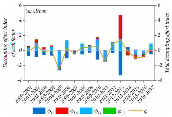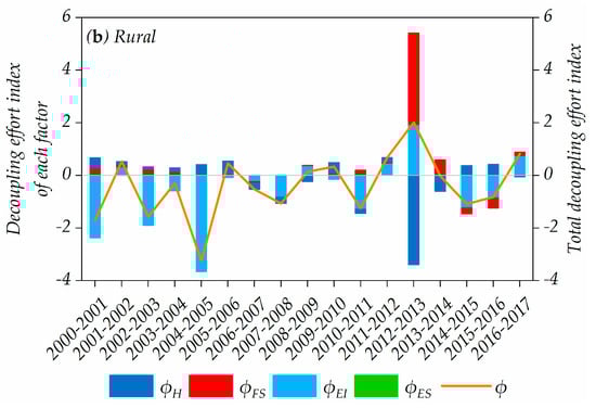 Decomposition of decoupling in Guangdong urban and rural regions during 2000–2017. (a) Urban. (b) Rural.