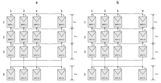 BIPV system connected in Total Cross-Tied (TCT) configuration with a simple Series-Parallel connection; (a) 5 × 9 connected system, (b) 9 × 5 connected system.