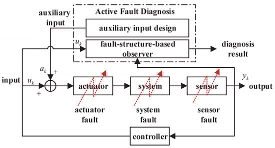 Fault diagnosis techniques can be divided into passive and active types []. Passive fault diagnosis (PFD) approaches only utilize the original input and output signals of the system, and, when the fault characteristics are not fully represented in the data, the diagnosis performance is not good. For example, due to the existence of system noise or uncertainty, system changes caused by incipient faults with small amplitudes are indistinguishable from system changes caused by system noise or uncertainty. In addition, the feedback controller in closed-loop system will cover up or compensate the system abnormality caused by fault to a certain extent, which will lead to the poor performance of passive fault diagnosis. In contrast to PFD, active fault diagnosis (AFD) will actively design auxiliary signals according to the fault modes and inject them into systems to excite fault characteristics and improve diagnostic performance []. Therefore, active fault diagnosis techniques are utilized in this article to detect and isolate incipient faults.