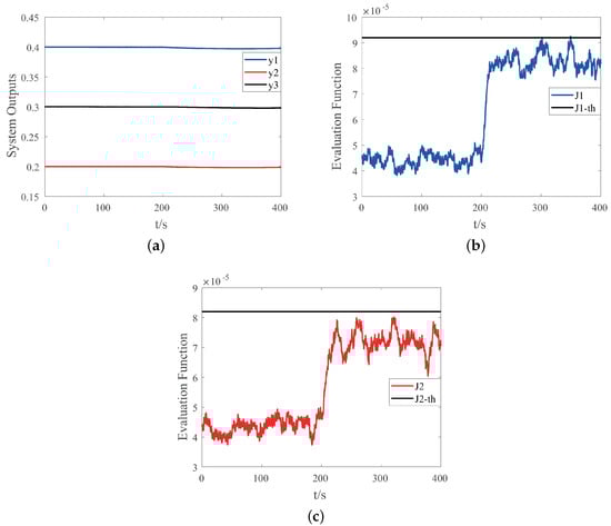 Simulation results of the system without faults and two auxiliary signals and are injected into the system at 200 s: (a) system outputs; (b) the evaluation function of the residual and the corresponding threshold; (c) the evaluation function of the residual and the corresponding threshold.