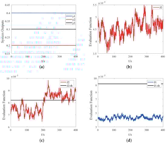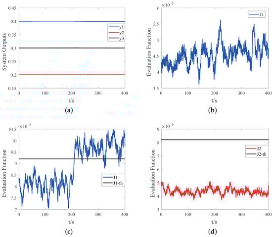 Simulation results of the system with fault mode occurring at 200 s: (a) system outputs without auxiliary signals; (b) the evaluation function without auxiliary signals; (c) the evaluation function with auxiliary signal ; (d) the evaluation function with auxiliary signal .