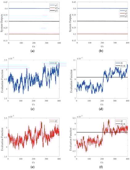 Simulation results of the system with fault modes and occurring simultaneously at 200 s: (a) system outputs without auxiliary signals; (b) system outputs with auxiliary signals; (c) the evaluation function without auxiliary signals; (d) the evaluation function with auxiliary signals; (e) the evaluation function without auxiliary signals; (f) the evaluation function with auxiliary signals.