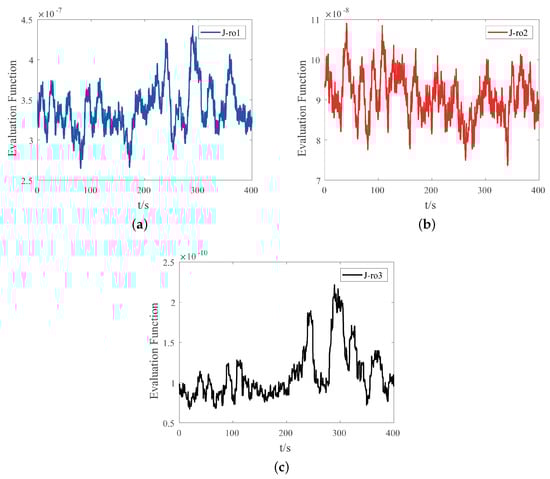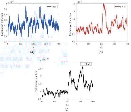 Simulation results of robust observer with fault modes occurring at 200 s: (a) evaluation function of the first robust observer; (b) evaluation function of the second robust observer; (c) evaluation function of the third robust observer.