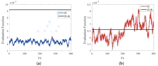It can be seen that both failure modes are time-invariant, so the auxiliary signals can just select the constant signals to meet the requirements. According to Section 3.2, the auxiliary signals for two faults are designed as and , respectively. The length of the evaluation window is set to be s, and the thresholds are selected as and .