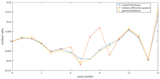 Bring (36) into (15), and re-simulate the state transformation model and reliability model of the gearbox. The residual values of the predicted state and the actual state when the models belong to Weibull distribution, ordinary differential equation, and gamma distribution are shown in Figure 3.
