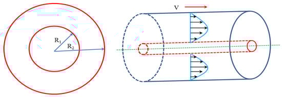 As shown in Figure 1, for the annulus with inner and outer radius distributions of R1 and R2, the r coordinate is established along the radial direction with the center line of the annular space as the origin. At the place away from the entrance and exit, the strip flow element with thickness of 2r, length of L, and width of π(R1+R2) is taken. Considering the steady flow of cement slurry, the momentum of flow microelement is conserved. The external force acting on it—that is, the resultant force of pressure at both ends π(R1+R2)2rΔP, whose direction is the same as the flow direction, is the driving force—that is, the flow resistance caused by shear stress τ on the upper and lower sides of the element 2Lτπ(R1+R2). The momentum balance equation is obtained as follows: