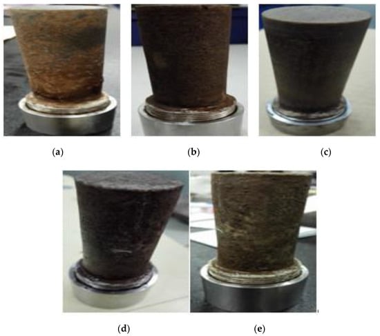 Five pairs of samples (as shown in Figure 4) are selected for flushing experiment. They are field sandstone (Figure 4a), ultra-low permeability core (0.01 mD) (Figure 4b), low permeability core (0.15 mD) (Figure 4c), medium permeability core A (10 mD) (Figure 4d), and medium permeability core B (150 mD) (Figure 4e). The morphology of some rock samples after washing is shown in Figure 5.