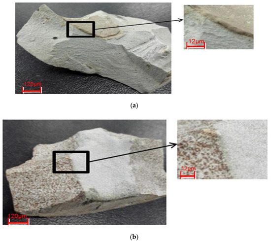 From the macroscopic observation in Figure 15, it can be seen from the macroscopic observation that during the cementation process, the cement stone is cemented with the mud cake on the core surface, which makes the mud cake adhere to the cement stone (Figure 15a); when the clean core is cemented with the cement stone, the cement stone and the core are directly cemented (Figure 15b). Therefore, the bond strength between the undrained core and the cement stone is lower than that between the clean core and the cement stone.