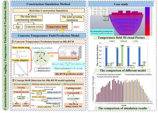 At the concrete temperature field prediction model level, it contains the concrete temperature interval prediction model and the concept drift detection for model updating. The details are as follows: (1) In the sublevel of temperature interval prediction model, firstly, the tent chaotic map and cosine adaptive methods are adopted to improve the performance of the grasshopper optimization algorithm (GOA). Secondly, the IGOA is used for parameter optimization of the HK-RVM prediction model. (2) In the sublevel of concept drift detection for model updating, a concept drift detection based on the variable window technique is proposed to update the prediction model to avoid prediction performance degradation. Firstly, the error of new data is analyzed based on the established temperature interval prediction model. Secondly, the sliding window size is determined according to the error analysis results. Thirdly, whether concept drift occurs depends on the change of the sliding window size. If the concept drift occurs, the temperature interval prediction model will be retrained. Finally, a dynamic concrete temperature interval prediction model can be established.