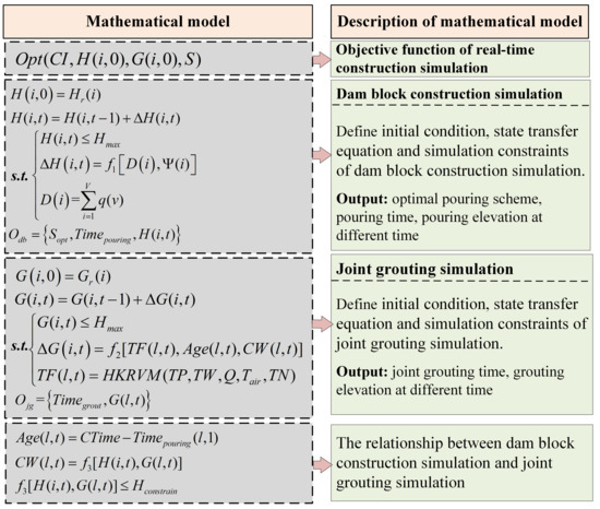 According to the construction method of arch dams, the construction simulation of arch dams can be simplified into two parts: the dam block construction simulation and joint grouting simulation. According to the requirements of construction specifications, the joint grouting should consider not only the concrete internal temperature in the temperature control area during the construction period but also the concrete age and cover weight. The concrete age is related to the pouring time of the dam block, and the concrete cover weight is related to the current dam pouring face, and these are all obtained by the dam block simulation. The concrete temperature field is predicted by the HK-RVM interval prediction model. In addition, dam construction progress and joint grouting progress are mutually restricted due to the cantilever height constraint. The real-time construction simulation mathematical model is expressed in Figure 2. The model defines the objective function of real-time construction simulation, dam block construction simulation, joint grouting simulation, and the relationship between dam block construction simulation and joint grouting simulation. The detailed descriptions of the symbols are shown in Appendix A.