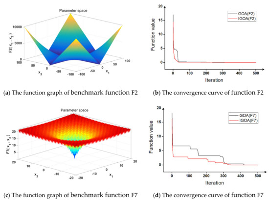 For solving the test functions, 50 search agents and 500 iterations were employed. Firstly, the convergence rate and global optimization ability are tested on the unimodal functions (F2) and the multimodal functions function (F7). Figure 3a–c shows the function graph, respectively. Figure 3b–d shows the comparison of the convergence curve. The results show that IGOA has faster convergence rates and strong global optimization ability. Considering the randomness of the algorithm, it is necessary to verify the repeatability of the IGOA. Then, each of the benchmark functions (F1–F10) was calculated 50 times. The statistical analysis results of benchmark functions (F1–F10) are provided in Table 1. The IGOA is obviously superior to GOA in both unimodal and multimodal function optimization problems.
