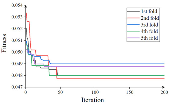 The convergence curves for the five models are shown in Figure 4. The majority of the modeling converged smoothly around 40–50 iterations. The fitness values of each model were almost the same when the model converged. Then, the temperature prediction intervals model was established. The prediction intervals are shown in Figure 5. The target values are basically within the prediction intervals at a 95% confidence level. The model performance (prediction accuracy and generation ability) will be stated in the Discussion section.