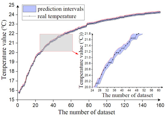 The IGOA optimized HK-RVM was adopted to establish the concrete temperature interval prediction model in this section. The dataset was divided into a training dataset and a testing dataset using a five-fold cross-validation. Then, 20% of the data were used as the testing dataset, and the remaining 80% were used as the training dataset. For the parameters involved, the control parameter of tent chaotic map was set as 0.5, the population number of IGOA was set as 20, and the maximum number of iterations was set as 200, the attraction intensity between grasshoppers was set as 0.5, and the length scale of attraction was set as 1.5.