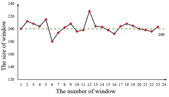 With the progress of the project, the temperature data are increasing quickly, which may exist concept drift. This will lead to the decline of the model prediction performance. Here, 4800 pieces of temperature data were collected, and then these data would be input one by one into the established HK-RVM model for concept drift detection. As mentioned in Section 3.2.3, we determine whether concept drift occurs by observing the size of the sliding window. Here, the basic window size was set as 200, and the specified threshold (the number of target values exceeding the prediction interval) was set as 10. Then, the size of the sliding window would be obtained, as shown in Figure 6. The size of each window fluctuated around 200, but the size of the 6th and 12th windows changed significantly. It shows that there is a sudden concept drift and the model needs to be retrained.