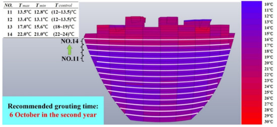 In the real-time construction simulation mathematical model, the joint grouting simulation included three important parameters: the concrete age, the cover weight, and the temperature field. The concrete age and cover weight can be obtained using a dam block construction simulation. The temperature field is predicted by HK-RVM, as described in Section 4.1. According to the construction technical requirements, the concrete age in the grouting area should be more than 120 days old, and the cover weight of the grouting area should be more than 27.0 m. Besides, a cooling area, a transitional cooling area, and a covering area must be set above the grouting area. Generally, the water-cooling process is divided into the first cooling stage, the midterm cooling stage, and the second cooling stage. When joint grouting, the temperature of the grouting area and the cooling area should reach the target temperature of the second cooling stage (also called closure temperature), and the temperature of the transition area should reach the target temperature of the midterm cooling stage. In this case study, the target temperature of the first cooling stage was 22–24 °C, the target temperature of the midterm cooling stage was 18–19 °C, and the target temperature of the second cooling stage was 12–13.5 °C.