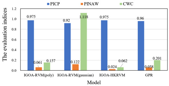 In this section, the prediction accuracy and generalization ability of the model were evaluated to illustrate the superiority of the proposed model. To illustrate, the training dataset is used to measure the model prediction accuracy, while the testing dataset is used to test the generalization ability. Then, the RVM model with different kernel functions (polynomial kernel, gauss kernel, and hybrid-kernel), and Gaussian process regression (GPR) were employed to compare the model performance. Three measurements were employed to compare the model performance: prediction interval coverage probability (PICP), prediction intervals normalized average width (PINAW), and coverage width-based criterion (CWC). The PICP represents the probability of the target value falling into the constructed confidence interval. The PINAW is applied to measure the width degree of the prediction interval. Generally speaking, the larger the PICP is, the more reliable the prediction interval is. The smaller PINAW is, the more accurate the prediction interval is. However, the reliability and accuracy of the model cannot be satisfied at the same time, so PICP and PINAW are contradictory indexes. The CWC can consider comprehensively the reliability and accuracy of prediction intervals. When the CWC is smaller, the prediction interval performs better in reliability and accuracy. The formulas for these measurements are presented in [56]. A detailed discussion is presented below.
