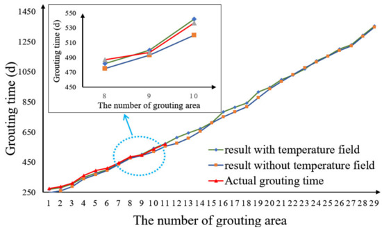The 3D cloud picture of the temperature field and the recommended time for joint grouting.
