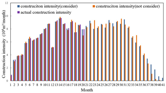 The traditional simulation method ignores the influence of the temperature field on the joint grouting. In order to prove the advancement and applicability of the proposed method, we set the simulation results without considering the temperature field as the comparison scheme. Firstly, the joint grouting time comparison between the proposed method and the comparison scheme is carried out. The comparison between the joint grouting time with and without the temperature field and the actual grouting time is shown in Figure 9. The vertical coordinate shows the joint grouting time for each grouting area (take 15 March in the first year as time 0). According to the simulation results of the 1st to 11th grouting area, the joint grouting progress lags behind the comparison scheme, but is closely in accordance with the actual grouting time. It shows that the joint grouting simulation considering the temperature field can obviously improve the simulation accuracy. Based on the construction simulation model and established temperature field prediction model, the grouting time of the other grouting areas can be obtained. It can provide guidance for the subsequent dam joint grouting construction. Then, the dam construction schedule comparison between the proposed method and the comparison scheme is carried out. According to the simulation results, the dam will be completed in July in the fourth year when the temperature field is considered, and the dam will be completed in June in the fourth year when the temperature field is not considered. The dam monthly construction intensity can also be obtained by construction simulation, which can provide a reference for the production and allocation of concrete resources. The comparison of the construction intensity with and without the temperature field is shown in Figure 10.