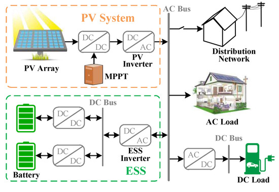 Figure 1 shows a master–slave-organized islanded microgrid with a PV system, where the system is not connected to the external power grid. The electrical energy generated by the PV array is transmitted to the load and distribution network directly. Due to the lack of voltage and frequency reference for the AC bus of the islanded microgrid, the ESS should be regarded as the master control unit, and ESS inverter should adopt constant voltage and constant frequency control strategy to maintain the voltage stability of AC bus. Therefore, ESS must be connected to the AC bus, which is called a centralized energy storage structure. Meanwhile, due to the control effect of ESS inverter, AC bus voltage can be regarded as stable, thus PV system should be regarded as the slave control unit to realize the control of output power of PV array.