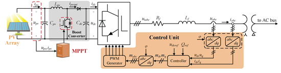 In recent years, distributed energy resources (DERs) have gained more and more attention because of their excellent economy and cleanliness. As the main representative of DERs, photovoltaic (PV) systems are widely used in power generation fields [1,2,3]. A PV system has two operating modes: grid-connected mode and islanded mode [4]. The grid-connection mode refers to the mode the connected microgrid with an external grid. The islanded mode refers to the mode in which the microgrid is not connected with the external grid, and the electric energy produced by the PV system is transmitted to loads or a distribution network directly [5]. An islanded PV microgrid can solve electricity problems in many remote areas where power lines are difficult to set up [6]. In such cases, PV panels, voltage source converters (VSC), filters and energy storage devices can be used to form a PV microgrid to meet electricity demands [7].