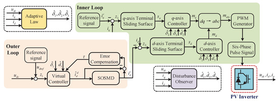 Block diagram of disturbance finite-time adaptive sliding mode backstepping (DFA-SMB) controller for PV inverter.