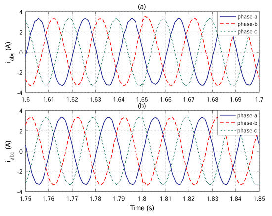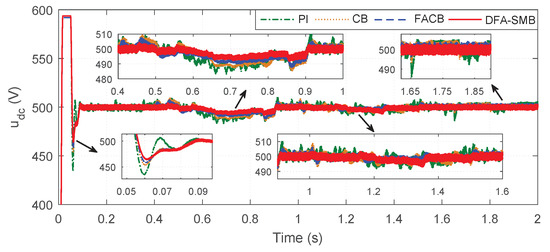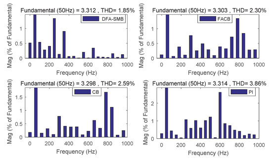 In the simulation, the reference value of q-axis is set to 0, that is to say, we want the output reactive power of the PV system to be 0. Phase-contrast between the output voltage and current in the PV system under the DFA-SMB controller is shown in Figure 10a. This shows that the DFA-SMB controller is also effective in reactive power control. Figure 10b shows the output three-phase current of the PV system under the DFA-SMB controller. The output current of the PV system changes steadily when solar irradiance and temperature change, and the output power is changed by varying the current. Therefore, the quality of the output power depends on the output current. In Figure 11, we compare the total harmonic distortion (THD) of the output current controlled by different controllers when the system is stable. It is worth noting that the THD of PV system output current under DFA-SMB scheme is , while it is under PI control, under CB control and under FACB. We concluded that DFA-SMB also has excellent control performance in steady-state, meeting the requirement of power quality. Furthermore, Figure 12 shows the three-phase current curve in the presence of load variations under the DFA-SMB controller. The system is disturbed due to load transformation at 1.65 s and 1.8 s, while the output current under DFA-SMB controller has little distortion when a disturbance occurs and can quickly return to stability, thus further verifying the dynamic performance and robustness of the DFA-SMB controller.