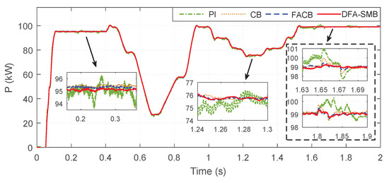 The same conclusion can be drawn from Figure 7, indicating the output active power comparison of the PV system under different controllers. The chattering problem of the active power curve is the most serious under PI control, and there is a large fluctuation during load variation at 1.65 s and 1.8 s. In contrast, the active power curves controlled by CB and FACB controllers are relatively smooth, but they are still sensitive to external disturbances. In addition, by observing lumped disturbances with DO, the fluctuation in the output active power is further reduced, and the impact of load variation on the output power is significantly suppressed.