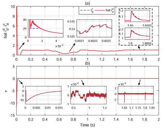 In model-based control, the control effect depends on the accuracy of model information. However, in the actual operation of the system, there are measurement errors in resistance , inductance , and capacitance . Therefore, the adaptive control is introduced to achieve online parameter identification. The adaptive parameters are defined as follows: