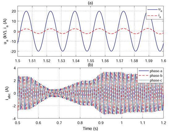 (a) Phase contrast between output voltage and current in PV system under DFA-SMB controller at t = 1.5–1.6 s. (b) Output three-phase current of PV system under DFA-SMB controller at t = 0.5–1.2 s.