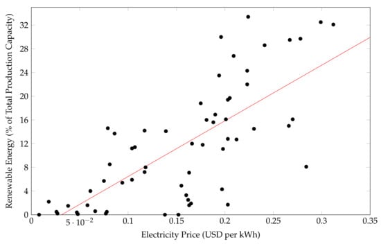 There are three outliers to the relationship shown in Figure 1. Denmark and Germany possess high RE production values (53.6% and 49.9%, respectively). At these values, the conjecture does not hold as the initial RE investment costs are recovered. It follows that dependence on fossil fuels is reduced, and subsequently, electricity prices decline [1]. These two countries are still included in the training dataset. Bermuda has a high electricity price of $0.387 per kWh with zero RE production capacity. This is an example where RE production capacity data did not reflect observed investment. One shortcoming of this model is a low coefficient of determination of 0.53.