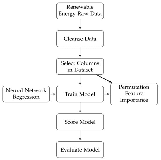 This paper develops an NN regression model utilizing 10 features to improve the accuracy of predicting RE investment. Although the research focus is primarily on the impact of electricity prices on RE, the influence of features such as population growth, Gross Domestic Product (GDP), quality of life, intelligence quotient, carbon dioxide emissions, and other metrics are investigated with the NN prediction model. The model was developed, trained, and deployed using Microsoft’s Azure Machine Learning (AML) Studio. Figure 2 shows a flowchart of the ML process implemented.