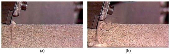 Two dominated failure mechanisms can be observed along the entire scratching action: ductile and brittle modes [4,5]. The ductile mode is the main failure mechanism when the depth of cut (DOC) is relatively small [6]. The rock acts as plastic in this situation and the cuttings are in the form of powder (see Figure 1a). As a result of grinding, the scratching process would become a smooth process with moderate fluctuations of the tangential force. On the other hand, the brittle mode reveals when the DOC reaches above the critical depth of cut (DOC). A discontinuous set of cracks is created underneath the cutter face in this model, as coalescence cracks propagate toward the free surface of the rock sample (see Figure 1b). During the chipping process, the cutting force starts to rise with the initiation of a crack. It has an upward trend until the crack propagation ends. Then, the shear force experiences a sharp drop, as cracks break into the groove surface [6].