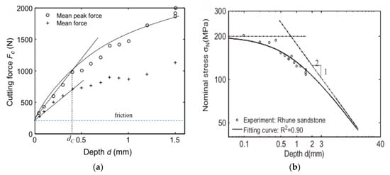 As seen from Equation (7), is the transition point between two different trends. In other words, illustrates the transition for the rock cutting process. Zhou and Lin [18] applied Equation (7) to Rhune sandstone sample to obtain acceptable fits. As highlighted in Figure 2b, this approach does not fit the Rhune sandstone results very well since the higher correlation coefficient value ( is 0.9. The critical DOC for Rhune sandstone is found by fitting cutting data to be 0.8 mm.